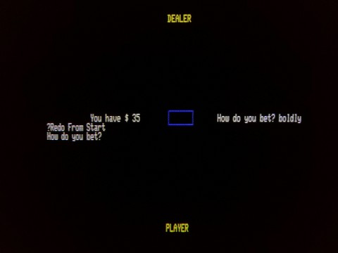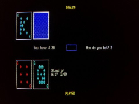 Black Jack starts out with a long-winded drawing of each card, with a long pause between Queen and King to really ratchet up the tension, I guess. I won this hand skillfully and pocketed five 8-bit dollars, then quit while I was ahead. Before rebooting, I confirmed my suspicions that “How do you bet?” is not expecting an adverb.