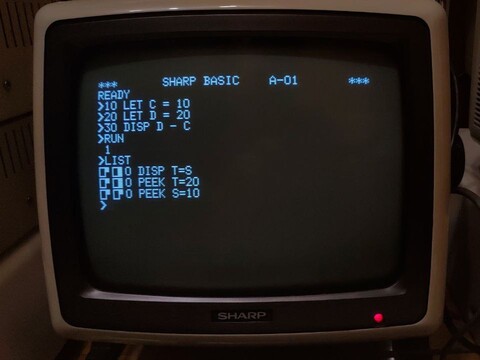 First, when you make an error, the PC-3100S *really* wants you to stop and think about what you've done. It beeps three times, displays your error at the bottom, and doesn’t give you your cursor back! Never seen anything like it. As far as I can tell, you have two options for proceeding, up-arrow to get your line back and fix it, or CL to erase the line and start over. DISP seems to work the same as PRINT in standard BASIC. Perhaps in this BASIC, PRINT is for interacting with a printer? This is far from the only difference in BASIC. From the one and only source of information I could find about this system, which also isn’t terribly detailed, this BASIC is similar to Sharp’s pocket computer BASIC. So that might be a source of information, too.