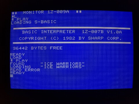 A tale of two MZ-700s. The game Ice Warriors was developed for the MZ-700 in Europe, but I have an MZ-700 for the Japanese market. The systems are compatible, having the same hardware configuration. The only differences are on the keyboard and in the character ROM. But sometimes that’s critical! ![]() I picked this up on the cheap from eBay, even shipping to Japan was not very expensive. However, when I tried to load it from the monitor, it didn’t find any data. Is the format of the tape somehow inherently incompatible? Is the tape bad? I tried both sides, but nothing. Then one day, I stumbled upon some information: programs written in BASIC are saved with a different identifier and not picked up by the monitor’s loader. Now that I think about it, it makes sense, since the MZ-700 has no built-in BASIC. So I tried loading BASIC, switched the tape, then loaded Ice Warriors. And it found the program! And then READ ERROR! ![]() But I’m not going to be deterred at this point. I tried a few more times with no success, so I tried the back side. It also produced a load error, but the second time it worked! I can play Ice Warriors! ![]() Well, the title screen looks pretty good, if you assume the text is actual Japanese. The problem is, it’s not. The difference between the character ROMs is affecting the ability to play the game. What that is actually trying to say is: of VALTEC Copyright Solo Software Please wait whilst game is set up. Or at least, I would bet money that is what it’s supposed to say. It’s what I expect it is saying based on the length of each word, repeated characters, commonly used verbiage with old games, and process of elimination. But I still refused to give up after I got this far. I slowly worked through the cryptogram to create a character and get into the game, even going so far as to have one battle, which was also messed up due to the character ROM differences, but that’s okay. I felt very satisfied getting this far! And those beautiful graphics were worth my several hours of effort over the past year or so. ![]() ![]() ![]() |