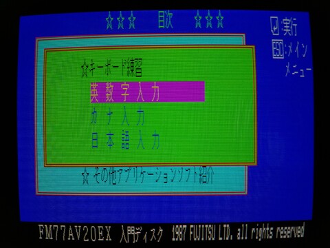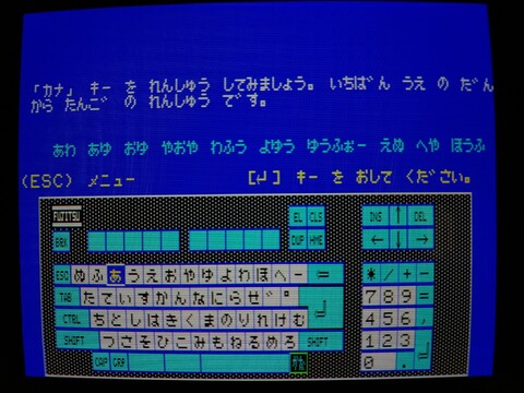 This is the keyboard practice branch of the menu. It is divided into three sections: alphabet, kana entry, and complex entry including kanji. Keyboard entry should not be so exciting, but I learned some good information here. ![]() First is alphabetic entry. We can see that upon completion of a typing task, it tells us how long it took and how many mistakes we made. Don’t judge, I was typing in the dark to get a good picture! My most common mistake was my hands being shifted one column over from the home keys. ![]() ![]() Next is kana entry. On a Japanese keyboard, even to this day, there is a hiragana (or sometimes katakana) character printed on almost every key. One keypress adds or alters one character. ![]() ![]() It is a crude system to enter every possible sound made in Japanese. By the kana alone, you can enter an entire text document, and in fact people used to do it that way. Nowadays, very few people use this method, but the same layout is still available in today’s keyboards and understood by modern OSes. Finally, the most interesting to me, is complex entry. Honestly, I didn’t think 8-bit computers had the capacity to operate this way. ![]() ![]() I’ll spare details here, because it will probably get its own entry later. But this system is not so different from the much more modern, convenient IME entry. If you press ctrl-A, you switch to this newer method, and ctrl-S puts you back into kana entry. Actually, either method is capable of complex entry, but the newer method will be much more comfortable to people who didn’t use Japanese computers until after the 90s. |