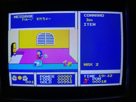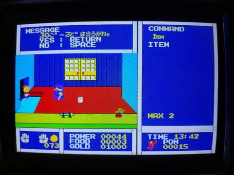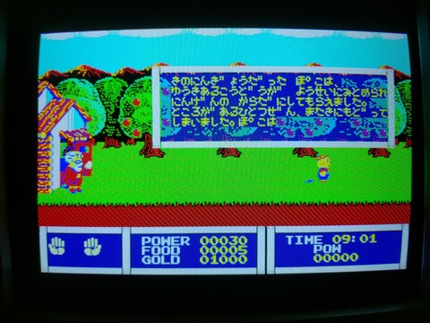 Tonight I tried out Woody Poco. I had been under the misconception that you played a woodpecker, but actually you play a wooden boy. It seems to be an adventure game where you can save your progress as you go. It’s a bit hard because I sometimes run into enemies that can kill me in one hit, so I’ve only explored about eight overworld screens, but the game is so far quite fun and shows a decent amount of depth. The overworld is bright and vibrant but can turn dark and dangerous at night. At one point, shooting stars attacked me but later in the game I found some kind of cross and a helmet, so perhaps that is protecting me, or maybe the shooting stars only appear on certain screens. From the overworld screen, so far, there are two other kinds of screens to be accessed – underground holes and buildings. You can buy, sell, give, or trade items in different locations that help you progress through the game. Many stores say they only serve women, so I am guessing you need to find someone else on your quest who complements you in your journey and you can then go back to previously inaccessible locations. There haven’t been many kinds of enemies, but one in particular was kind of interesting – the old men. By default they are jolly and blue in color, and they only bump into you and hurt you a bit, taking a bit of your money in the process. But if you try to attack them, they turn violent and bright red, becoming incredibly powerful. They will charge at high speed and kill you. So they’re just something to put up with, it seems, not fight against, but maybe later you can get revenge. It’s another game with 400-line graphics (640×400) and FM sound, the graphics look quite good compared to the previous game I was playing (Euphory), but the music is similarly short and repetitive. ![]() ![]() ![]() ![]() ![]() ![]() ![]() ![]() ![]() ![]() ![]() ![]() |