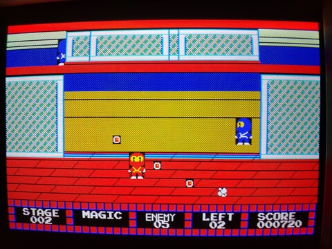 On the first level, you run around and shoot enemy ninjas when their heads appear over the wall. Get ten and a door opens so you can progress to the next level.