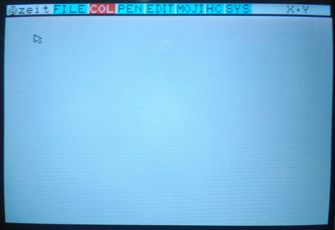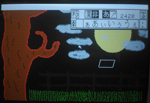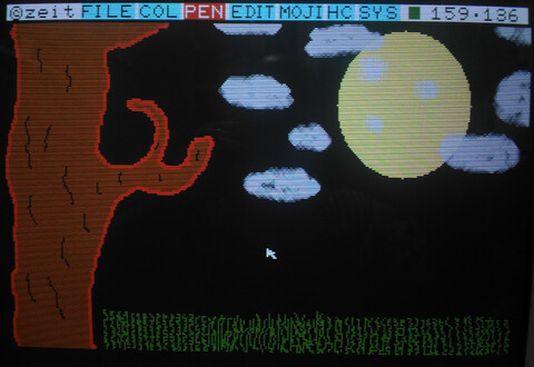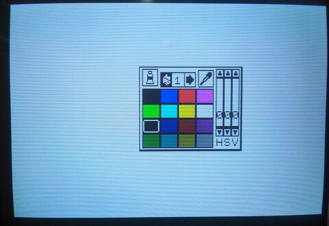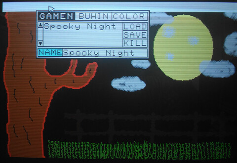 I finally got around to firing up my X1’s included “Graphics Tool”, part of the included “Z’s Staff-Z” software bundle that came with my system. I am no artist by any stretch and I figured loading up and attempting to use an 8-bit paint program would be an excruciating exercise. But I wanted to explore more about my Sharp X1 Turbo Z. There were definitely moments of frustration, but it was also a great experience. The opening screen launches you into low-res mode where you have two choices for video resolution – 320×200 or 640×400. Images made in one resolution cannot be opened in the other. I went with 320×200 for starters. ![]() The interface appears minimal, with a single row of menu options at the top. The entire screen is your canvas. ![]() If you look at the final picture, most people would probably imagine that the background was filled first first, but that’s for people who have a plan, and that does not include me! Nonetheless, to make it look like a progression of the picture creation process, I went back and took a screenshot of a black screen. ![]() Here’s what actually happened first: I’m not particularly creative in this kind of environment, but I grabbed the mouse and started free-drawing a curvy line. I thought perhaps it could become a tree, so I went with that. When I finished the base structure of the tree, I mixed a custom brown color and filled the tree, then I thought the tree didn’t look quite normal, but perhaps I could give it some legitimacy by making it a creepy environment, so it became a nighttime sky. ![]() In terms of screenshots, several steps were skipped, such as “make a circle” and “draw the tree”, but I’m not trying to write a tutorial for the picture, just an introduction to the program! Next I finished the moon with just a simple circle and added some “craters”, which sounded good at the time but actually probably made it worse. Added some grass by drawing sloppy lines with the freehand tool. But the part I like best is the clouds. I struggled with those clouds, trying this and that with different pen sizes, different shades of gray, different diffusion tools, nothing I tried didn’t look like garbage. I actually gave up on the clouds for a while, but there is no screenshot of that stage, so here’s another fast-forward screenshot: ![]() Having given up on the clouds, I thought I’d make a wooden fence. I thought I saw a tool that would be good for that, but once I started drawing the fence with it, I quickly learned that this was, in fact, the tool for drawing clouds. The fence was ultimately made by a series of thin, dark brown lines (so dark it barely shows up in my photograph, but believe me, they’re there!), and then going back to the freehand tool with black to give the fence a more unkempt appearance. ![]() There’s really a fence there! It looks fine on the real computer! And that’s about enough for the picture. Hokusai, I am not. But the program left a good impression on me. As much as I thought that this antiquated program would be tedious for me to get anything done with, I was pleasantly surprised. For a 128KB computer, they crammed in a lot of features and made it a nice tool to explore and even an amateur can have a little fun with it. ![]() Best save this for posterity. When I become a famous artist and then die, people will discover this disk like they did Warhol’s. The edit page was surprisingly powerful compared to my impression of the icons. I assumed it was just simple things like flip or rotate the entire image, but actually you make a selection of what you want flipped or rotated. You can also copy and paste (which I wish I’d known before I did the grass). It also has a “grow selection” function that does a decent job of stretching out elements of your image. ![]() The text input took some time to figure out. You can only add one character at a time, and it appears to be fixed spacing. But there are some cool effects available, too. You can use or turn off any of the three features – characters, outline, and shadowing. Outline and shadow are basic but the unusual thing to me is being able to turn off the characters, so you can just have the outline and/or shadow. You can also set double width, double height, and italics for the characters. ![]() The only part that I find really frustrating is that it has no concept of “undo”. But I think there just isn’t enough memory for it to remember what pixels were changed and what their original colors were. So “undoing” is actually “cover up with an appropriate color” or “restore from last save.” So getting back to the resolution choices at the launch of the program, the reason I went with 320×200 is because it allows access to the computer’s generous 4096-color (12-bit) color palette. Thanks to a hefty 96KB of video RAM, each pixel can have its own color. Obviously I didn’t take advantage of that, but I could have! The software offers you five pages of 16 quick-select colors, but you can alter the colors anytime with the HSV (hue/saturation/value) sliders, and changing a color does not affect pixels already drawn on the canvas using the previous color. ![]() ![]() 640×400 is four times the resolution, so is limited to 8 colors (3-bit color). Some of the interface elements are replaced with kanji so it looks a little different. And as you can see, it looks a lot cleaner. And of course, all the extra real estate that 4x resolution provides is nice. But you’re giving up 4088 colors! ![]() ![]() At first I couldn't believe they had to drop down to 8 colors for 640x400. Surely they could squeeze some more color out of 4096, right?! But I checked the numbers and it is indeed necessary to drop down to 8 colors to achieve 640×400. Look: 320×200 = 64000 pixels, 4096 colors = 212 (12 bits = 1.5 bytes) 64000 * 1.5 = 96000 640×400 = 256,000 pixels, 8 colors = 23 (3 bits = .375 bytes) 256000*.375 = 96000 As the comp