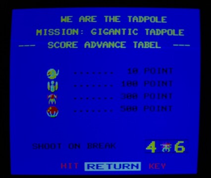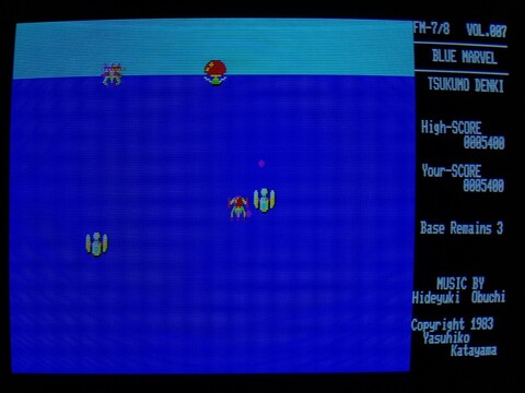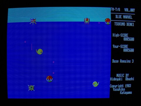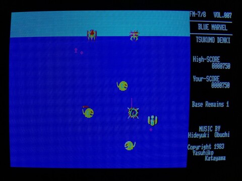The title screen makes it sound like you can expect an underwater-flavored ripoff of Galaxian, but it actually isn't very similar at all (unlike Attack Sea Monster, which is 100% an underwater-flavored ripoff of Galaxian). For one thing, your character is on the top, not the bottom, and you're not attacking a wall of aliens in the sky, you're attacking a sparsely-populated ocean of relatively random-moving creatures. Some move vertically and try to join you up top, which if memory serves, restricts your movement and makes the game harder. Pretty fun and looks nice on the FM-8, which doesn't have a tremendous library of nice-looking action games.