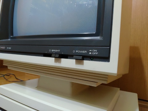 However, while digital RGB is usually quite useful considering the number of early Japanese machines that use it, they sabotaged this one by not putting a horizontal position control on the user-accessible side; I have connected about half a dozen machines and the ONLY one that is correctly positioned is the FP-1100. Everything else cuts off a bit on the left. I imagine there's an adjustment pot on the inside, but... that's convenient?! I looked it up in the manual and it indeed indicated that if your display is off to the left, the cause is that your "front porch is greater than 8.013 microseconds", which is technical speak for "too bad, get an FP-1100."