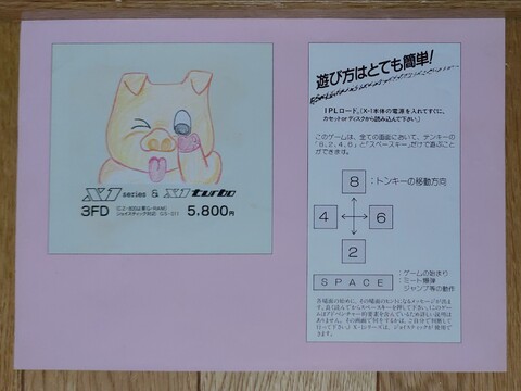 The packaging is unique. The outer box has a window on the pig's rump that shows the inside of the package, which includes a tray with the game disk and a stack of sheets of paper. The top page displays the system info and price, which is what you see in the window. Underneath that is a loose-paged picture book. I like the packaging, but you do have to be careful with it so you don't snag any corners of the illustrations. The floppy itself is reflective silver with blue letters, unique for this system where most games are pink and white because they mostly come from Hudson Soft.