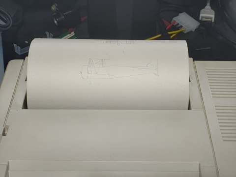 But while I wouldn't have wanted it, I decided to test it because it's Pasopia7-branded, and that's one of my favorite systems. So I cleared out some space to set it all up and see if it worked as expected. It basically did. Unsurprisingly, the pens were all but done. One of them was working just enough to give the faintest reproduction of the printer/plotter demo tape's airplane program. Prepare to strain your eyes! The final picture was taken under better lighting conditions for this subject, but the second-to-last photo is about how it really looked.