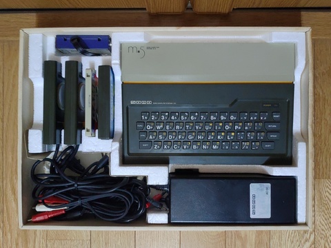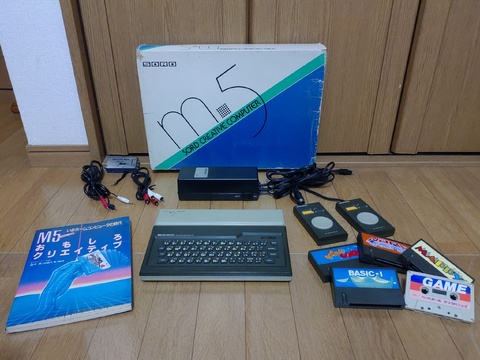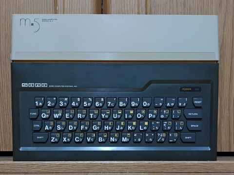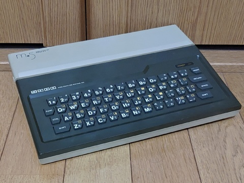 | I made an article about the Takara Game Pasokon a while back, but recently I came across the machine that the Game Pasokon is a clone of, the SORD m5. Such a clone, in fact, that almost nothing is different. The primary color of the case is dark gray instead of dark blue, but even the secondary color and accent color are the same. That and the branding, using "SORD" and "m5" where "Takara" and "Game Personal System" were on its clone.               It even had the same PSU, about  twice the weight of the computer itself.    The controllers inherit the system's palette.        And it came with the same accessories as the Takara Game Pasokon.      This one lacked the manuals but included this extra book, with a few full color pages and plenty of programs to type in.       This time around, I had a different selection of games - Warp&Warp, StepUp, and Mappy. StepUp was maddening, but the other two were engaging.       |
