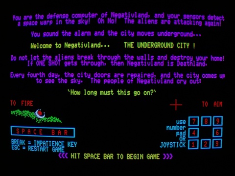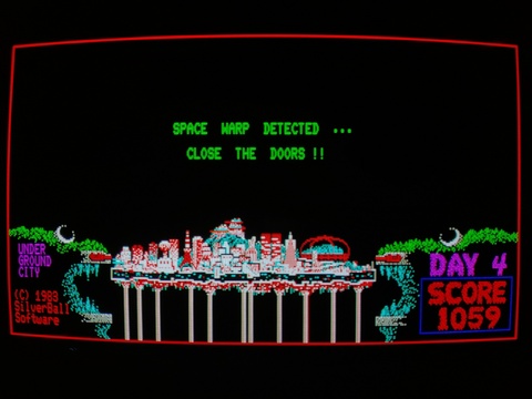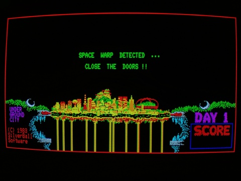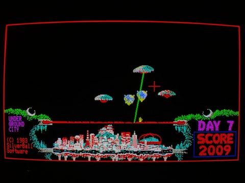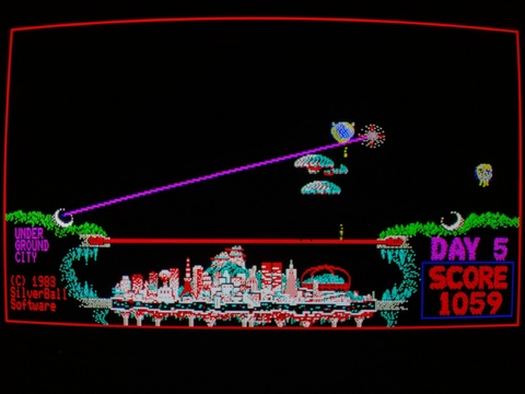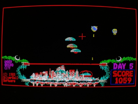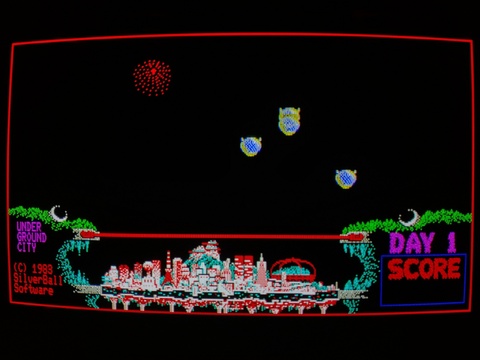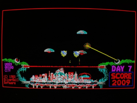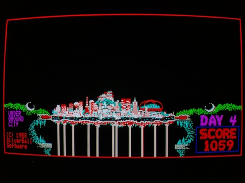 Underground City is a brilliantly colorful game with solid gameplay. It is reminiscent of Missile Command, but this game is played under sudden death rules. There is only one city to protect, which is hidden under a barrier. Each hit from an enemy opens a very small hole in the barrier, and if a second attack finds its way through one of the holes, it will hit the city and the game is over. If you survive a day, the barrier is rebuilt. The difficulty setting is not cranked up too high. as on my first play I managed to make it to level 7. The first title screen is tremendously unimpressive, but everything else is graphically well done. There's a good variety of enemy ships, and the explosions are nicely executed. ![]() ![]() ![]() ![]() ![]() ![]() ![]() ![]() ![]() ![]() ![]() ![]() ![]() ![]() ![]() ![]() This game was released by SilverBall Studios, who also released Cloud Kingdom for FM-7. ![]() ![]() ![]() |