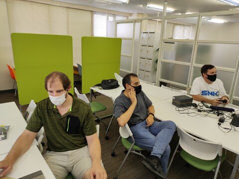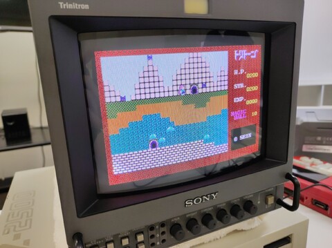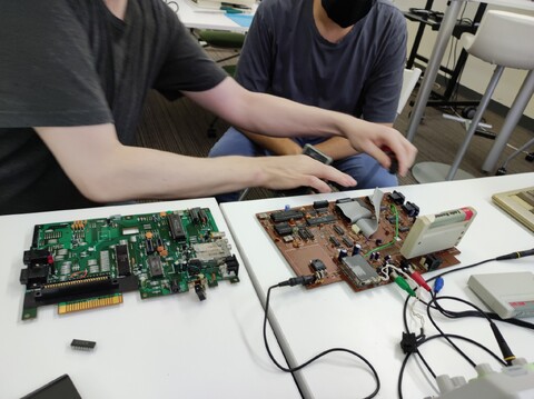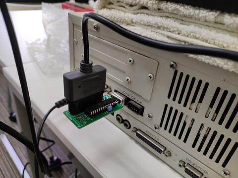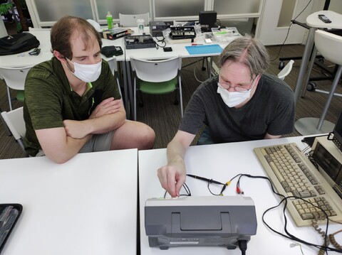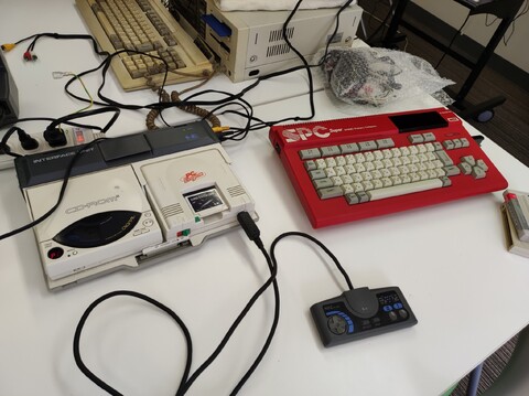 Edoardo and Sean were first on the scene. Edoardo brought his Super Famicom gamepad controller adapter that attaches to the MSX-style game ports of many Japanese computers. And Sean brought with him just such a computer – the MZ-2500. We tested the controller adapter with Xevious and it proved to be good and responsive with no detectable lag as far as us middle-aged men could tell. Very nice solution!