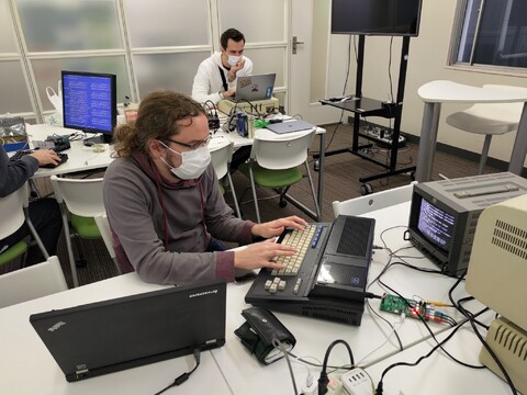 Sean had recently picked up a number of games for the MZ-1500, which he had also brought along. The new ones were all made by Dempa Micomsoft and are mostly arcade/action but also include an RPG, unusual for that system. David spent some time perusing the source code of the game TNT Bomb Bomb (and promptly making a JavaScript implementation of it!), and Edoardo took a look inside and listed the capacitors in case of future repair.