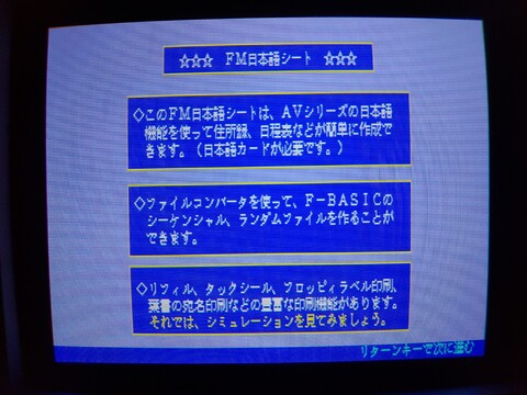 2019年09月13日 - FM77AV20EXの紹介(システムディスク5/5):その他のソフト This final branch of the demo disk is probably the most interesting to me. I love games, but I’m also really interested in 8-bit productivity applications. This highlights some of the productivity apps available for this system. 続き⇒ |