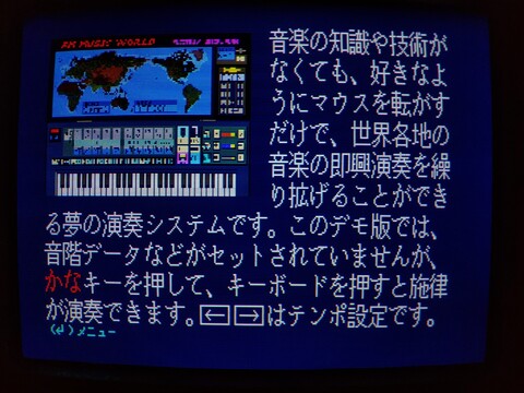 2019年09月12日 - FM77AV20EXの紹介(システムディスク4/5):オーディオソフト As alluded to in the third article in this series, the machine has a 3-voice FM synthesizer (in addition to a 3-voice PSG synthesizer, for a max of six voices at once). I believe you could squeeze the full functionality of this by simply using the PLAY command in BASIC, but I am sure musicians would generally prefer a music composition software package with a GUI that is more intuitive and visual. Fujitsu’s got you covered! 続き⇒ |