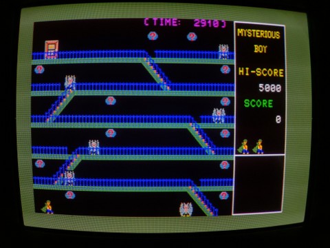 The next game is Mysterious Boy, a slow-paced action platformer. Climb up the screen and collect weapons, bonus points, and a key to escape the door at the top.