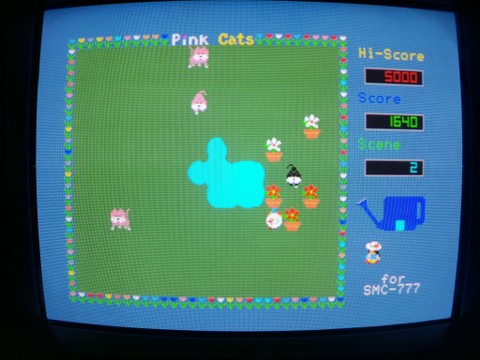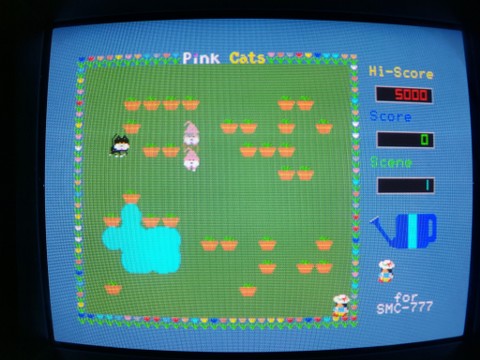 And finally is Pink Cats, the title being a bit strange because so far I’ve only encountered pink dogs and black cats. You walk around the garden, keeping your plants hydrated while the rambunctious pink dogs obliterate your plants by running into them, and the black cat tries to kill you. Actually I haven’t read the manual, it may not be so sinister that the cat kills you, perhaps you just have an allergy.