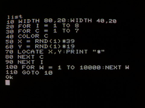 It’s capable of low-res graphics and 40- or 80-column text display with 8 colors over digital RGB, pretty typical of those that followed it until the mid-80s. There was also a third-party PCG (programmable character generator), an add-on device that I don’t possess that allows for a character replacement approach to graphics. The PCG was integrated into the later PC-8001mkIISR, but both the add-on and the PC-8001mkIISR tend to be quite expensive.