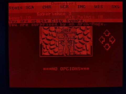 You may have noticed, but one thing about playing this game on this computer is that I can’t see my stats. I’m not exactly sure why, it would make sense if the game were SVGA, but since it’s EGA, there should be a one-to-one color mapping for the screen. Maybe my monitor ignores the intensity factor, allowing for only eight shades of orange? It’s a little hard to tell.