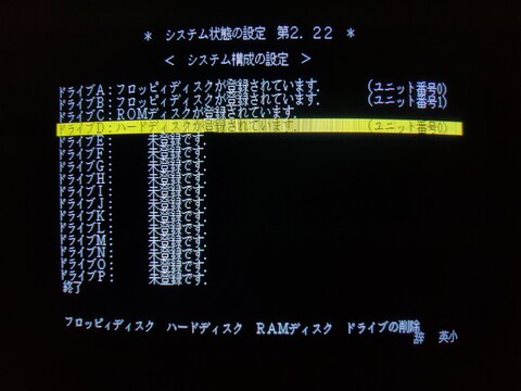 First order of business was dropping to a command prompt and running “setup.exe” from the “exe” directory (you can also do this from the Towns Menu, I later discovered, but perhaps I’ll add that info later). It should take you to the screen in image 3 . The first option in the list is where drive letter assignment is performed. Press enter to see the current configuration. If it is your first time adding a hard drive and you have two floppy drives, it should look like image 4.
