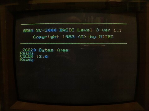 I poked around a bit with BASIC. 40-column text over RF can be highly unreadable, so it is critical to choose the right color scheme. Usually, a bold color on black background seems to work decently. The first picture here, black on blue, is also pretty readable, but I don’t think my receiver was tuned properly at this point because it seems the default background color should be green.