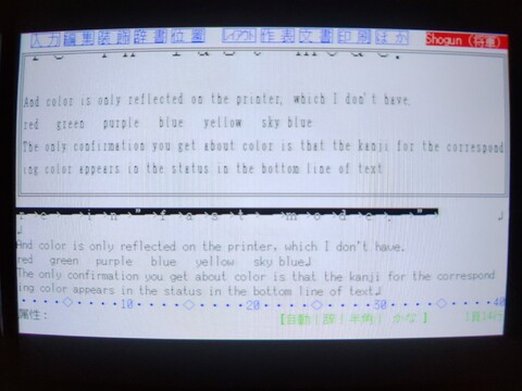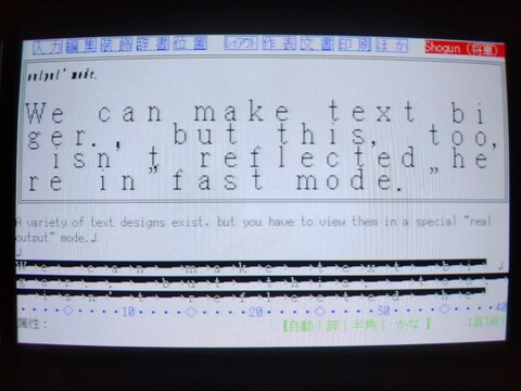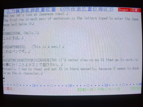 As I mention from time to time, I enjoy checking out and using productivity apps on my old machines. I recently joined Mercari and I found this little treasure nobody wanted. ![]() It’s Shogun, a word processor for the Sharp X1 Turbo Z. Yes, you need to go all the way to the Z model, because it comes on high-density floppy disks. Actually, the disk claims it’s for X1 Turbo, so I guess some later X1 Turbo models had HD floppy drives, as well? News to me! When you boot up, you are greeted by this beautiful opening screen. I had to get an animation of it! ![]() ![]() But once you get down to business, the glamour of the fancy title screen fades away quickly and you are greeted by a blindingly white screen. I’ll need to go back and take some better screenshots sometime. They looked pretty good on my phone, but uploading to full size they are quite blurry. For now, here are my low-quality captures of my text-typing adventures. The images kind of tell the story as I go, if you can read them First in English: ![]() ![]() ![]() ![]() Then a Japanese entry tutorial. Figuring out how to enter Japanese was a bit counter-intuitive, because they re-purposed the kana key on the keyboard. So I had to tell the menu to use full-width entry, then to use Japanese by pressing the kana key on the keyboard, which normally only allows you to type in using direct Japanese symbols, which is an outdated method of text entry. The software is smart enough to use romaji entry, so might as well take advantage of that, for sure! ![]() And one more type-up in pure Japanese. It was nowhere near as smooth to type as it is in modern Windows, but I could get the hang of it a bit. ![]() |