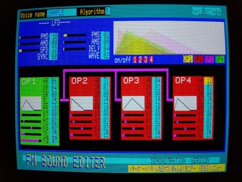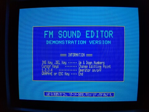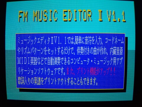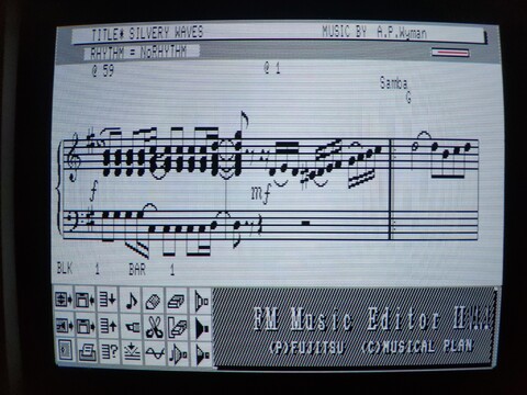 As alluded to in the third article in this series, the machine has a 3-voice FM synthesizer (in addition to a 3-voice PSG synthesizer, for a max of six voices at once). I believe you could squeeze the full functionality of this by simply using the PLAY command in BASIC, but I am sure musicians would generally prefer a music composition software package with a GUI that is more intuitive and visual. Fujitsu’s got you covered!