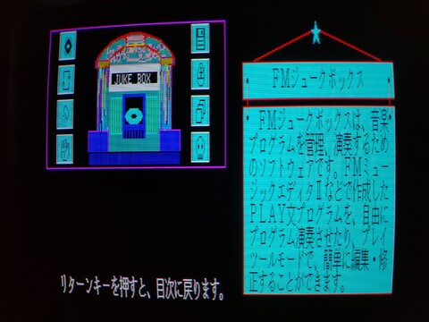 First is FM Music Editor. Based on my experience with the Sharp X1 music editing software “V.I.P.”, I probably wouldn’t really be able to do much with this software even if it were physically possible, but unlike the X1, the FM77AV20EX doesn’t actually come with a software package, just demos, both passive and interactive. This demo was passive so it just started playing a song while displaying the music someone else had already composed. Which is good, because I couldn’t make that!