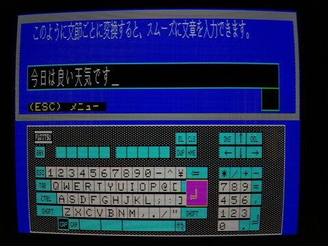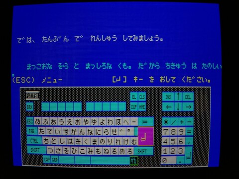This is the keyboard practice branch of the menu. It is divided into three sections: alphabet, kana entry, and complex entry including kanji. Keyboard entry should not be so exciting, but I learned some good information here. ![]() First is alphabetic entry. We can see that upon completion of a typing task, it tells us how long it took and how many mistakes we made. Don’t judge, I was typing in the dark to get a good picture! My most common mistake was my hands being shifted one column over from the home keys. ![]() ![]() Next is kana entry. On a Japanese keyboard, even to this day, there is a hiragana (or sometimes katakana) character printed on almost every key. One keypress adds or alters one character. ![]() ![]() It is a crude system to enter every possible sound made in Japanese. By the kana alone, you can enter an entire text document, and in fact people used to do it that way. Nowadays, very few people use this method, but the same layout is still available in today’s keyboards and understood by modern OSes. Finally, the most interesting to me, is complex entry. Honestly, I didn’t think 8-bit computers had the capacity to operate this way. ![]() ![]() I’ll spare details here, because it will probably get its own entry later. But this system is not so different from the much more modern, convenient IME entry. If you press ctrl-A, you switch to this newer method, and ctrl-S puts you back into kana entry. Actually, either method is capable of complex entry, but the newer method will be much more comfortable to people who didn’t use Japanese computers until after the 90s. |