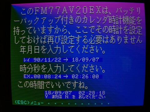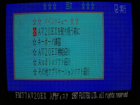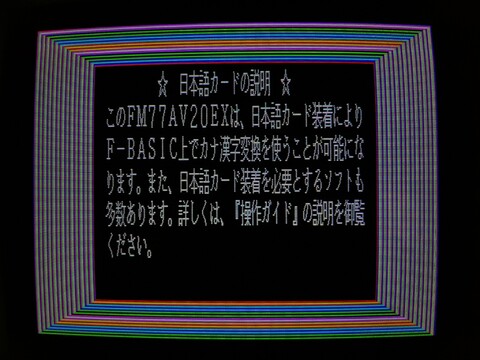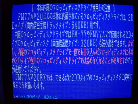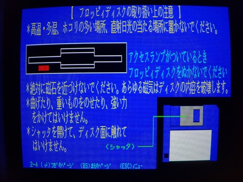 I have gone through every feature of my FM77AV20EX system introduction disk. It is too much information for one post, I feel. So I am breaking it up into five, one for each menu branch. As the first one is the shortest, it will also serve as the introduction. It is also the most boring and least interactive, so if it feels dry, wait for the third, fourth, and fifth articles! I will particularly like the second, but that’s my specific quirk about Japanese text entry. These screens below are loaded in sequence upon booting the disk, they are similar to a Windows loading screen or something along those lines. The third image mentions that the machine is equipped with a Japanese language card, which allows for the input and display of complex Japanese writing. This is covered a bit more in article 2, and will probably eventually get its own article. ![]() ![]() ![]() This is the first menu, each one opening up to its own submenu. In order: – Preparing to use the AV20EX – Keyboard practice – Features of the AV20EX – Introduction to audio software – Introduction to other software ![]() The first menu item just talks about handling floppy disks, the merits of backing up floppy disks, and allows you to set the date and time in a fancy-schmancy GUI. ![]() First the advice about handling floppy disks: ![]() ![]() ![]() ![]() Solid advice: Don’t put your floppy drives in extreme heat or high humidity or dusty places. Don’t put heavy things on the floppy. Don’t eat the floppy. Don’t open the shutter and touch the floppy. It says most of those things. But one piece of advice that is quite important is about compatibility with previous models. The FM77AV20EX comes with 3.5″ 2DD (640KB) floppy drives. The FM-77 and FM77AV came with 3.5″ 2D (320KB) floppy drives. It says that disks made for these older systems will work on the new one, but once you write data onto a 2D floppy disk, there’s a chance you can’t use that disk on the old systems again. I suppose you could format and use it again, but it doesn’t mention that. Next: Copy that floppy! But only this time. ![]() ![]() In the event your disk explodes, grows legs and runs away, etc. you want it to be a *copy* of your system disk, not the originals you’ll have to hunt down on Yahoo Auctions 30 years later, right? So copy those disks and use those copies. I did. And finally, let’s set that system time! ![]() Well, it sure does look nice and is extra informative when you compare it to MS-DOS’s “Current date is 6/15/88/Please enter new date.” But it does take a lot longer to load. |