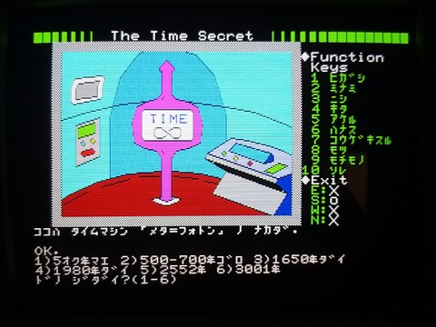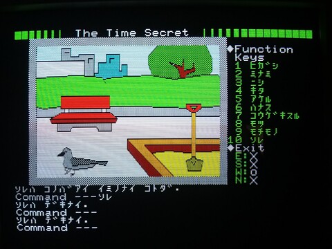 Tonight’s game is Time Secret. It’s a graphic adventure with a time-travel theme. The graphics are kind of interesting. Navigating the game is a little bit clumsy, because Japanese text entry in the 80s is nothing at all like it is today. It’s much smoother and streamlined now, and while I suppose I could get used to it, I would never want to go back to this style of text entry!