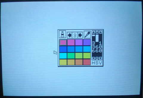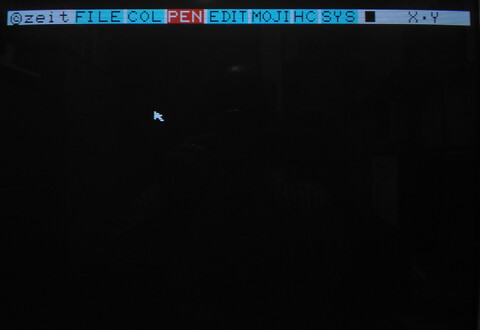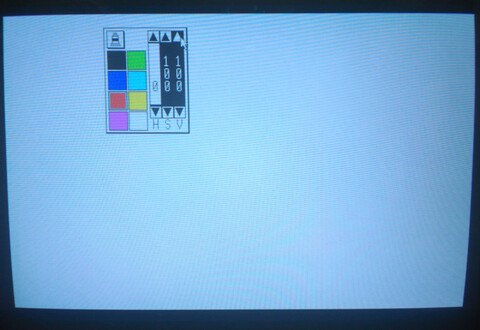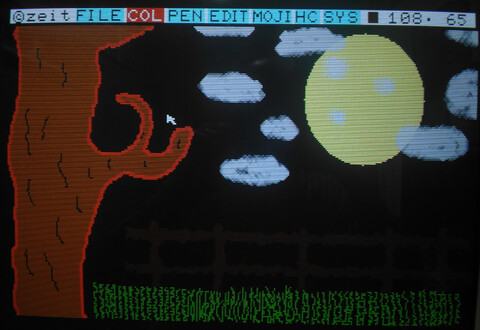 I finally got around to firing up my X1’s included “Graphics Tool”, part of the included “Z’s Staff-Z” software bundle that came with my system. I am no artist by any stretch and I figured loading up and attempting to use an 8-bit paint program would be an excruciating exercise. But I wanted to explore more about my Sharp X1 Turbo Z. There were definitely moments of frustration, but it was also a great experience. The opening screen launches you into low-res mode where you have two choices for video resolution – 320×200 or 640×400. Images made in one resolution cannot be opened in the other. I went with 320×200 for starters. ![]() The interface appears minimal, with a single row of menu options at the top. The entire screen is your canvas. ![]() If you look at the final picture, most people would probably imagine that the background was filled first first, but that’s for people who have a plan, and that does not include me! Nonetheless, to make it look like a progression of the picture creation process, I went back and took a screenshot of a black screen. ![]() Here’s what actually happened first: I’m not particularly creative in this kind of environment, but I grabbed the mouse and started free-drawing a curvy line. I thought perhaps it could become a tree, so I went with that. When I finished the base structure of the tree, I mixed a custom brown color and filled the tree, then I thought the tree didn’t look quite normal, but perhaps I could give it some legitimacy by making it a creepy environment, so it became a nighttime sky. ![]() In terms of screenshots, several steps were skipped, such as “make a circle” and “draw the tree”, but I’m not trying to write a tutorial for the picture, just an introduction to the program! Next I finished the moon with just a simple circle and added some “craters”, which sounded good at the time but actually probably made it worse. Added some grass by drawing sloppy lines with the freehand tool. But the part I like best is the clouds. I struggled with those clouds, trying this and that with different pen sizes, different shades of gray, different diffusion tools, nothing I tried didn’t look like garbage. I actually gave up on the clouds for a while, but there is no screenshot of that stage, so here’s another fast-forward screenshot: ![]() Having given up on the clouds, I thought I’d make a wooden fence. I thought I saw a tool that would be good for that, but once I started drawing the fence with it, I quickly learned that this was, in fact, the tool for drawing clouds. The fence was ultimately made by a series of thin, dark brown lines (so dark it barely shows up in my photograph, but believe me, they’re there!), and then going back to the freehand tool with black to give the fence a more unkempt appearance. ![]() There’s really a fence there! It looks fine on the real computer! And that’s about enough for the picture. Hokusai, I am not. But the program left a good impression on me. As much as I thought that this antiquated program would be tedious for me to get anything done with, I was pleasantly surprised. For a 128KB computer, they crammed in a lot of features and made it a nice tool to explore and even an amateur can have a little fun with it. ![]() Best save this for posterity. When I become a famous artist and then die, people will discover this disk like they did Warhol’s. The edit page was surprisingly powerful compared to my impression of the icons. I assumed it was just simple things like flip or rotate the entire image, but actually you make a selection of what you want flipped or rotated. You can also copy and paste (which I wish I’d known before I did the grass). It also has a “grow selection” function that does a decent job of stretching out elements of your image. ![]() The text input took some time to figure out. You can only add one character at a time, and it appears to be fixed spacing. But there are some cool effects available, too. You can use or turn off any of the three features – characters, outline, and shadowing. Outline and shadow are basic but the unusual thing to me is being able to turn off the characters, so you can just have the outline and/or shadow. You can also set double width, double height, and italics for the characters. ![]() The only part that I find really frustrating is that it has no concept of “undo”. But I think there just isn’t enough memory for it to remember what pixels were changed and what their original colors were. So “undoing” is actually “cover up with an appropriate color” or “restore from last save.” So getting back to the resolution choices at the launch of the program, the reason I went with 320×200 is because it allows access to the computer’s generous 4096-color (12-bit) color palette. Thanks to a hefty 96KB of video RAM, each pixel can have its own color. Obviously I didn’t take advantage of that, but I could have! The software offers you five pages of 16 quick-select colors, but you can alter the colors anytime with the HSV (hue/saturation/value) sliders, and changing a color does not affect pixels already drawn on the canvas using the previous color. ![]() ![]() 640×400 is four times the resolution, so is limited to 8 colors (3-bit color). Some of the interface elements are replaced with kanji so it looks a little different. And as you can see, it looks a lot cleaner. And of course, all the extra real estate that 4x resolution provides is nice. But you’re giving up 4088 colors! ![]() ![]() At first I couldn't believe they had to drop down to 8 colors for 640x400. Surely they could squeeze some more color out of 4096, right?! But I checked the numbers and it is indeed necessary to drop down to 8 colors to achieve 640×400. Look: 320×200 = 64000 pixels, 4096 colors = 212 (12 bits = 1.5 bytes) 64000 * 1.5 = 96000 640×400 = 256,000 pixels, 8 colors = 23 (3 bits = .375 bytes) 256000*.375 = 96000 As the comp