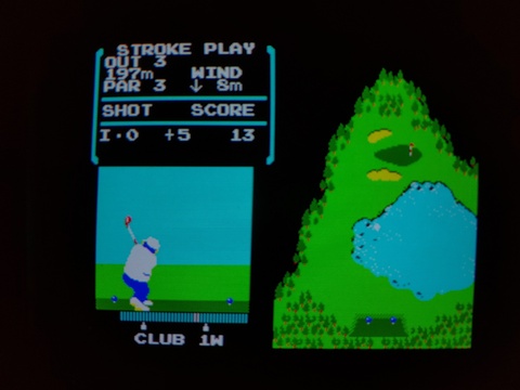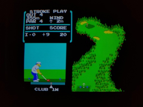 And Nintendo takes it up another notch with their early Nintendo Golf game. Most famously on the NES, and perhaps people remember it making appearances in their arcade as part of the PlayChoice 10 and VS. systems as simply "Golf", but it also got a release on a PC-8801 and X1 as "Nintendo Golf". Nintendo Golf eases up a bit on the precision required and focuses on fun through simplicity. But they still have the typical golf game mechanics and features, such as a variety of clubs, variable direction and power, and sand and water hazards. A good variety of courses, too!