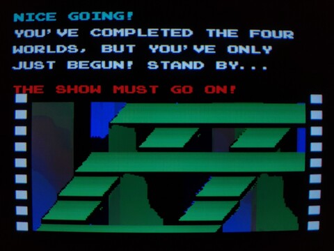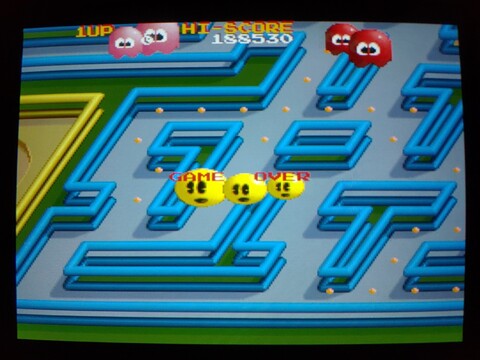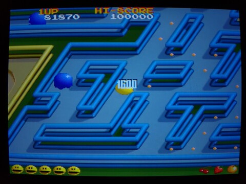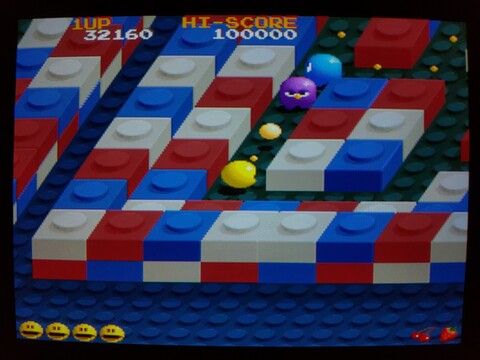 Once you finish all the worlds, the game still continues and has a few surprises. The fruit pattern continues with the traditional key and bell. The worlds repeat, but sometimes there are color palette swaps. The first time through, the green ghosts were introduced in stage 5. When you restart from the first stage, the green ghosts remain, but they don't jump until stage 5 again. And a gray ghost suddenly appears! It came out as a sort of blue on my first shot of it (second to last photo) so I had to adjust the camera and you can see it in the final photo.