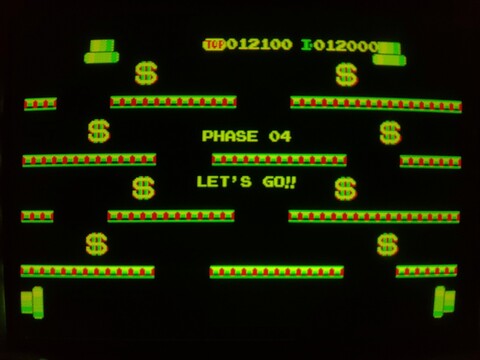 On stage two, you have to bounce on trampoline platforms with the enemies to cause them to turn over. If an enemy is stunned, you can knock them off, but if you jump on the platform again, they awaken and you're in danger. Later levels add new kinds of enemies. The sidesteppers (crabs) are not necessarily more dangerous or difficult than the shellcreepers (turtles) in this game, but the fighter flies (not pictured) add a challenge.