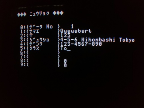 Casio chose a different path for its bundled software than most companies. While Sharp, NEC, and Fujitsu (and others) included some simple demos to show off the system's capabilities, Casio included regular software. I am sure someone who had an FP-1100 with its fairly limited range of software might appreciate this, but as someone who has amassed a bunch of old computers and realizes that the FP-1100 simply doesn't have that much software but still enjoys the machine itself, I wish they had included the demo. Oh well! ![]() ![]() This tape includes five programs. The first is a mahjong game. I hate playing simple mahjong implementations less than I hate "playing" shogi, but it's still not a lot of fun for me. Still, they used some nice, clean graphics and I can appreciate that. ![]() ![]() ![]() ![]() Next up is Space Transporter 2, and it makes me wonder how much different Space Transporter 1 was. That is just to say it's simple, but you can enjoy shooting things a bit on your FP-1100 until you save up enough money to buy Vegetable Crush or some other higher-effort shooter. ![]() ![]() ![]() ![]() ![]() ![]() ![]() Side B seems to be more about productivity. The first program is a graphics editor. You have a cross-hairs cursor to indicate your position, but the commands are all menu-based so you have to be able to visualize what you're after in your head a bit to get anywhere with this. Casio (or someone at Casio's request) made the first image, I made the second. ![]() ![]() Next is a spreadsheet. The translation of the title is literally "simple software", but it seems to be an abbreviation for "simple entry software", which seems to be a convention for describing spreadsheets. These days, we usually just say "ekuseru". Anyway, without the manual (actually I have the manual, I just didn't read it), it's hard to figure out how to use, but I entered some simple data. ![]() ![]() ![]() Finally is a contact manager, specifically a customer relations manager, but mostly it seems suited as a regular contact manager. I think this variety of software is more an exercise for the programmer than a practical solution for storing contacts, but maybe there is a particular balance where you have more data than you want to write in an old-fashioned address book, but not so big that it doesn't fit into available BASIC RAM? ![]() ![]() ![]() Don't call me, I won't call you! |