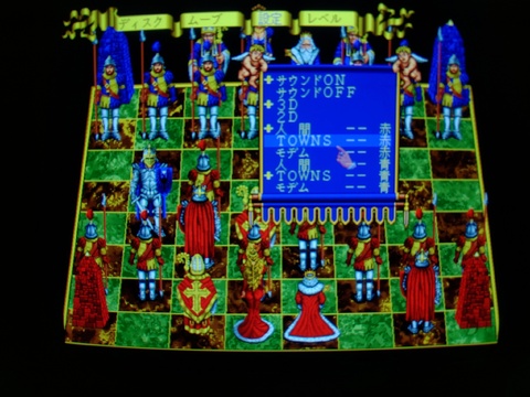 When you boot up your FM Towns with the CD-ROM in the drive, you are first dumped in Towns OS. You can choose from four options, play the game or watch the tutorial, and either of those are available in Japanese or English. Interestingly, they don't put English names on the English version icons! I guess they weren't too worried about native English speakers getting their hands on the FM Towns version. If you choose to play the game in Japanese mode, the menus are in Japanese. I don't think much else changes about the game. The second menu is choosing my favorite option... computer vs. computer; I just want to watch the animations!