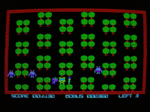 Field Wars is a bit like Alien in that you set traps in hopes that aliens (?) step on them. But instead of digging a hole for them to fall into, you bury a landmine. So when they step on the landmine, you don't have to go through the hassle of closing the hole back up, they explode and that's the end of them. But the trap is invisible so if you forget where you plant one, it will explode on you just as happily, taking one of your lives.