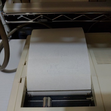 But while I wouldn't have wanted it, I decided to test it because it's Pasopia7-branded, and that's one of my favorite systems. So I cleared out some space to set it all up and see if it worked as expected. It basically did. Unsurprisingly, the pens were all but done. One of them was working just enough to give the faintest reproduction of the printer/plotter demo tape's airplane program. Prepare to strain your eyes! The final picture was taken under better lighting conditions for this subject, but the second-to-last photo is about how it really looked.