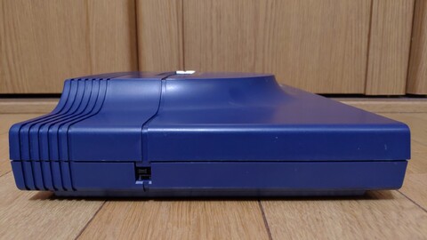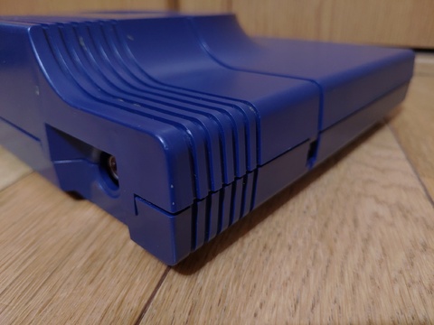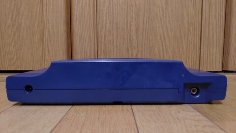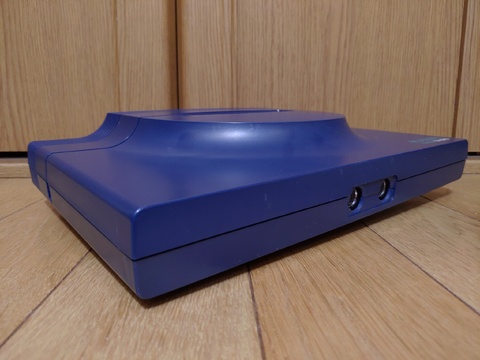 Despite its rough shape, the console itself is pretty cool, though. It looked like it would be cheap plastic like an SG-1000 series or Master System, but it's a pretty weighty console. And it's a handsome navy blue, with a slope leading up to a raised center dome which surrounds the cartridge slot.
