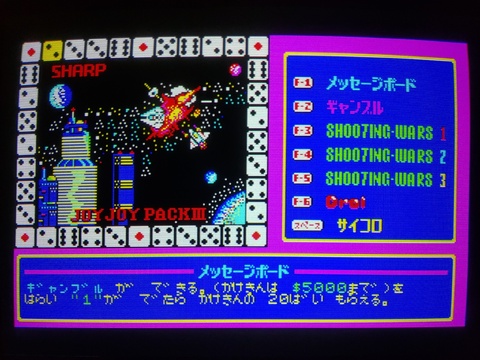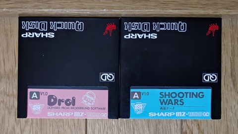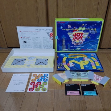 Despite reading the description, I didn't really know what I was getting myself into with this purchase. It's a never-opened (until now) Joy Joy Pack #3 for the MZ-1500. It contains two QuickDisks with two main games, Drol and Shooting Wars. It also came with a board game, but the board game is based on Drol, and relies on loading side B of the Drol QuickDisk.The software on side B acts as the dice and also produces in-game messages.