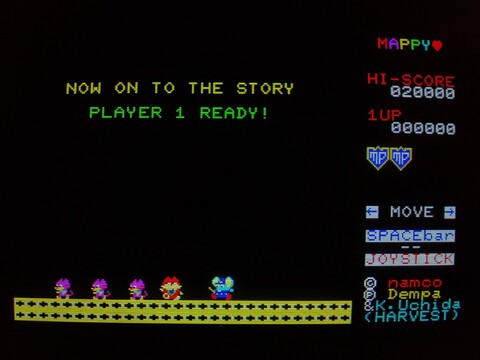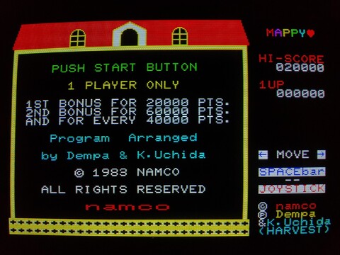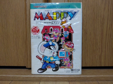 Somehow, I had never heard of Mappy until I started collecting Japanese vintage computers, though it seems it was also released in the US so I would have expected to have at least passing familiarity with it. This is a very fun arcade style game! You play a police mouse raiding the mansion of a nefarious cat gang to recover stolen goods. If they touch you while running on a platform, you lose a life.