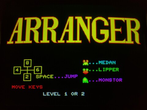 In Arrenger (on the box) or Arranger (on the title screen) your task seems to be arranging things. Specifically, arranging those little squiggly pegs on the platforms. I guess the goal is to arrange them in the layout displayed in the bottom-right of the screen, but maybe not exactly that simple? Some of the marked circles on the layout don't seem to match with reality. But I got 400 points so I must have done *something* right!