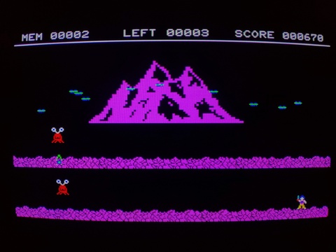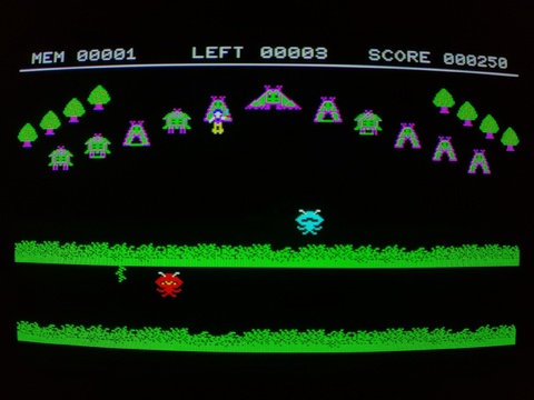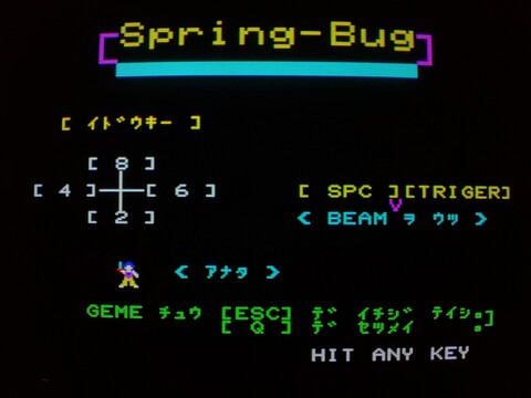 Spring Bug is a frustrating little game for the X1. You have to time your jump to first get to the ground level (much easier of the two goals), and then bounce your way up to the very top-center object of the screen (this is difficult!). Not only are your landing spaces very narrow for your erratic jumps, but you prone to being attacked during your ascent, and the floors that support you for your brief landing can disappear at any time! I had to watch a YouTube tutorial (as I am sure everyone did in 1983) to make sure I was even on the right path, and after I confirmed what needed to be done, I was still only able to make it to level 2 once!