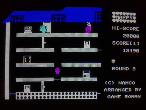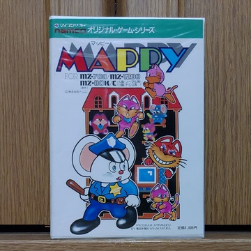 The MZ-700 port of Mappy has a standard (non-graphic) version on side A, and a PCG (programmable character generator) version on side B. The main gameplay is much like the arcade, but the sound is simple (as expected for the MZ-700) and it doesn't include the bonus stage. Only the layout and color of the house and the locations of the stealable items vary from one stage to the next. Still, this is a major arcade title for the MZ-700, so I am sure people were very happy to have it.