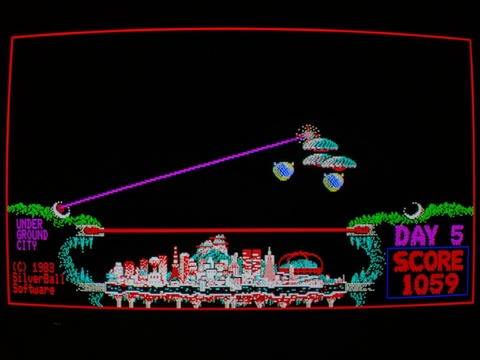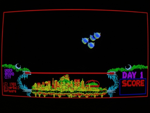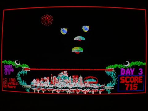 Underground City is a brilliantly colorful game with solid gameplay. It is reminiscent of Missile Command, but this game is played under sudden death rules. There is only one city to protect, which is hidden under a barrier. Each hit from an enemy opens a very small hole in the barrier, and if a second attack finds its way through one of the holes, it will hit the city and the game is over. If you survive a day, the barrier is rebuilt. The difficulty setting is not cranked up too high. as on my first play I managed to make it to level 7. The first title screen is tremendously unimpressive, but everything else is graphically well done. There's a good variety of enemy ships, and the explosions are nicely executed. ![]() ![]() ![]() ![]() ![]() ![]() ![]() ![]() ![]() ![]() ![]() ![]() ![]() ![]() ![]() ![]() This game was released by SilverBall Studios, who also released Cloud Kingdom for FM-7. ![]() ![]() ![]() |
