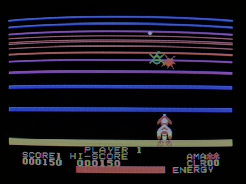 In this game, you run down an endless corridor of lines, shooting everything you can to rack up the high score. Lines get closer as they fade into the horizon, and the enemies get bigger as they get closer, making the 3D effect pretty convincing.
